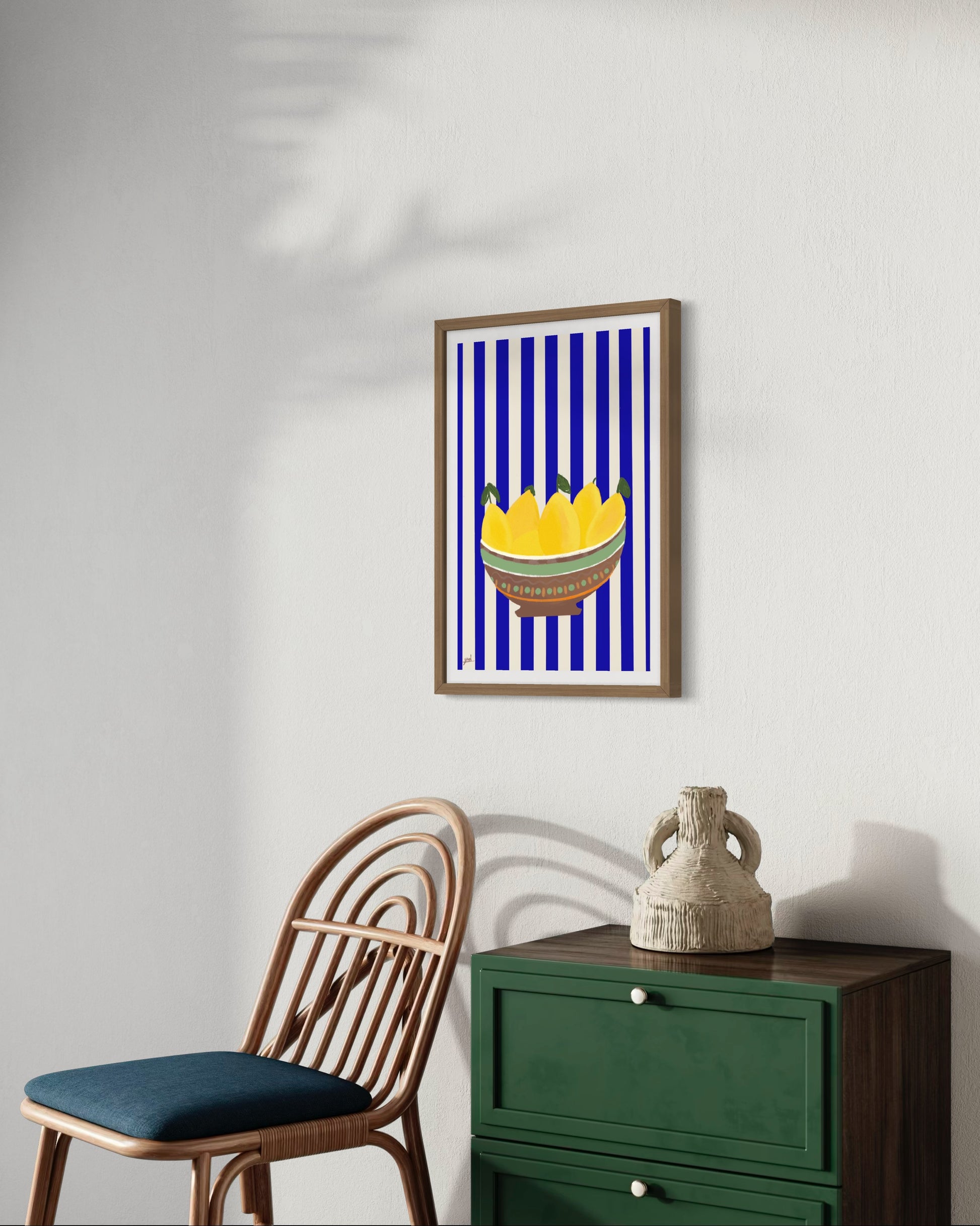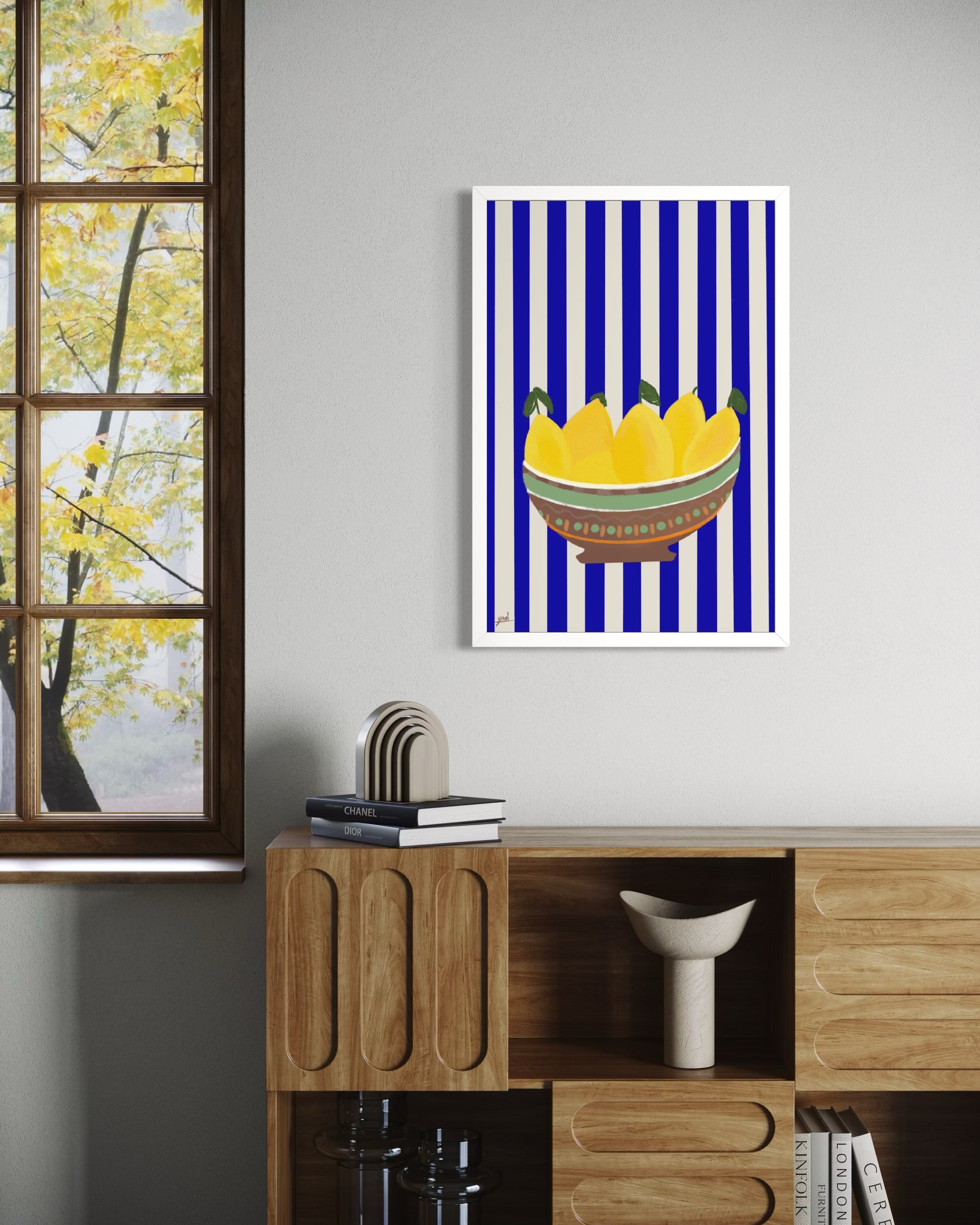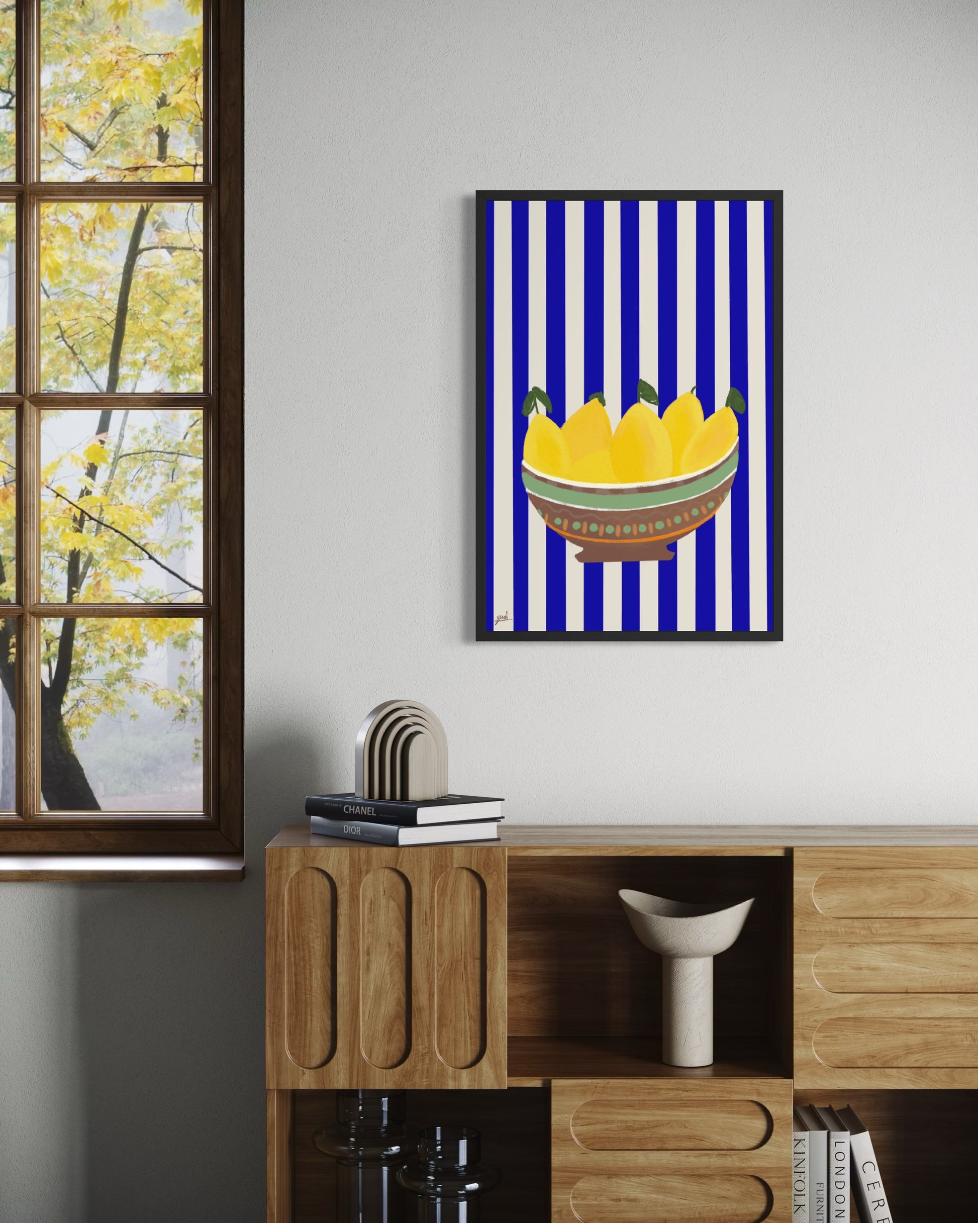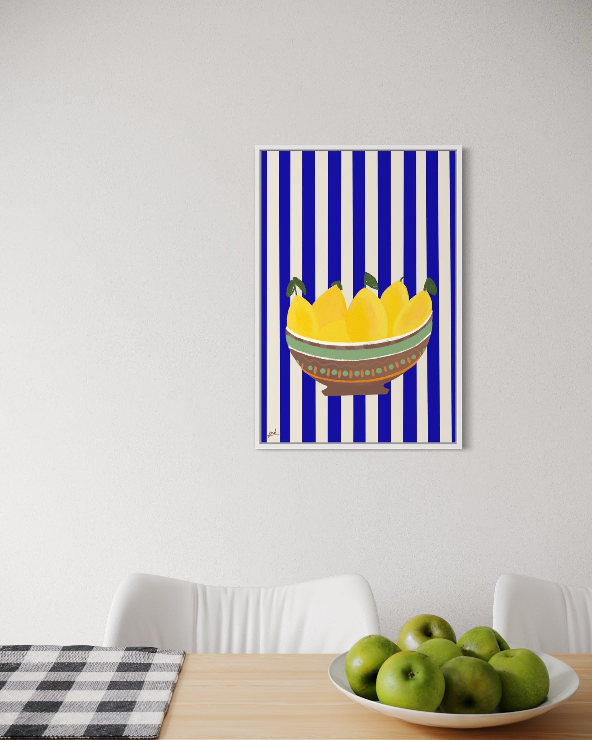 קערה חומה, לימונים צהובים, פסים כחול לבן.