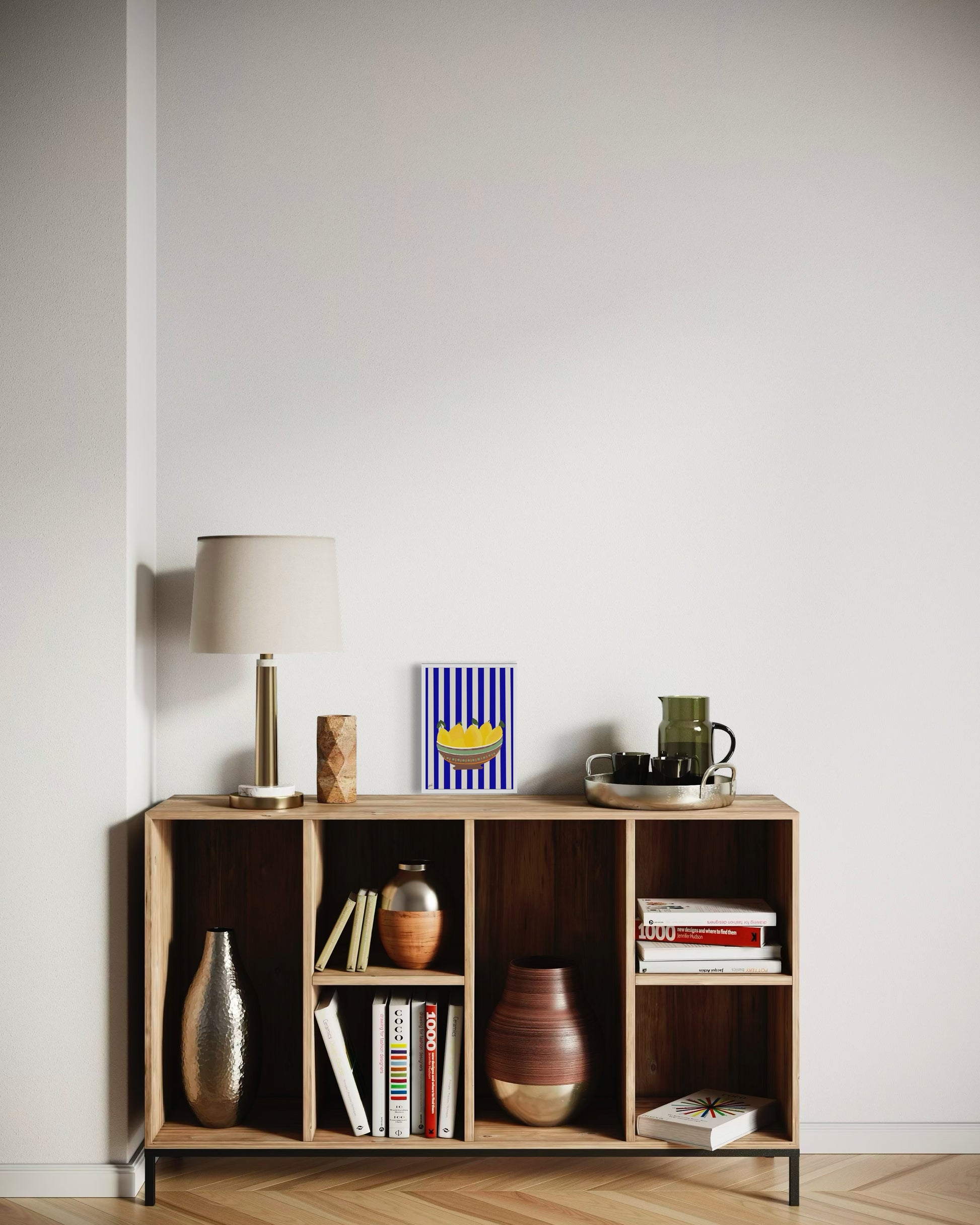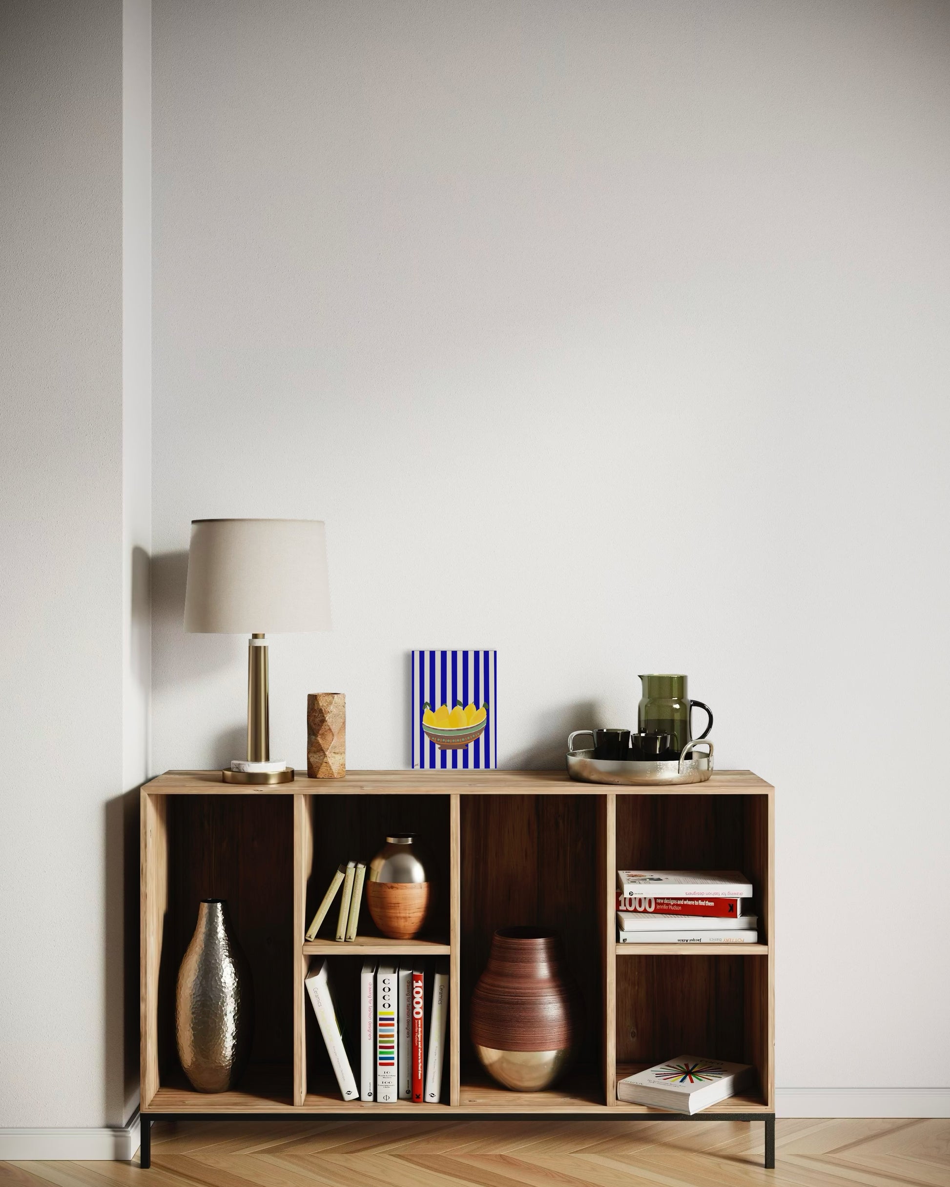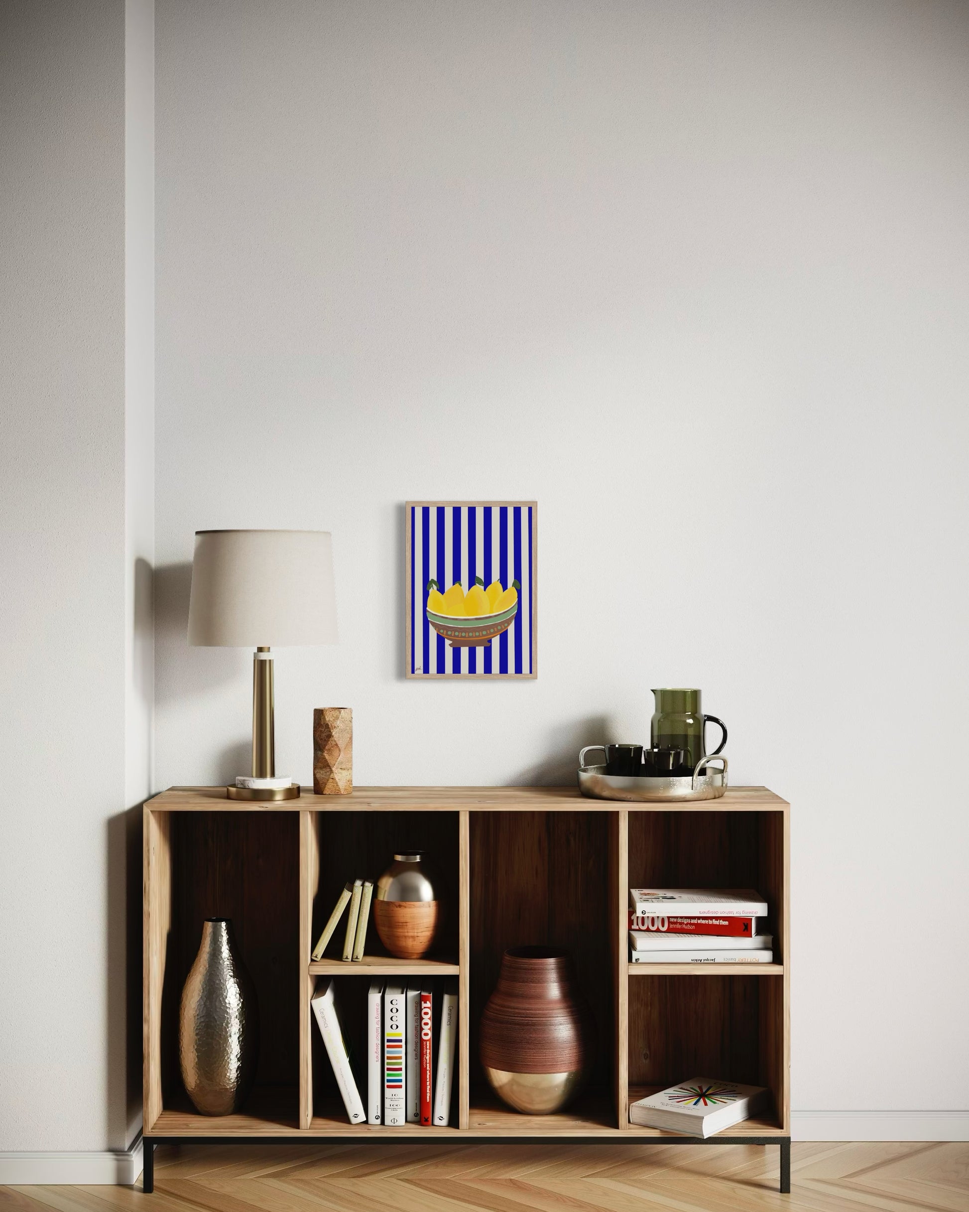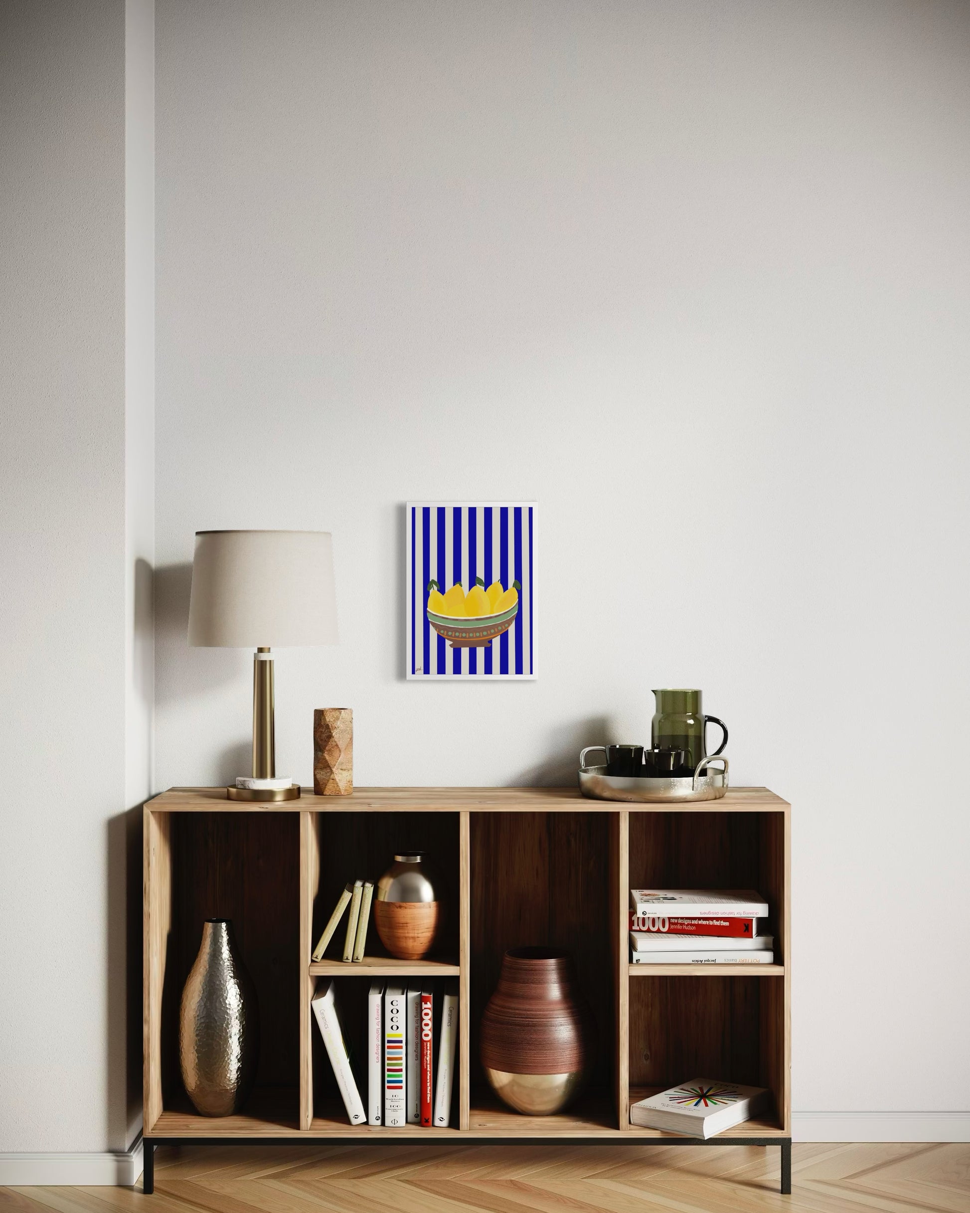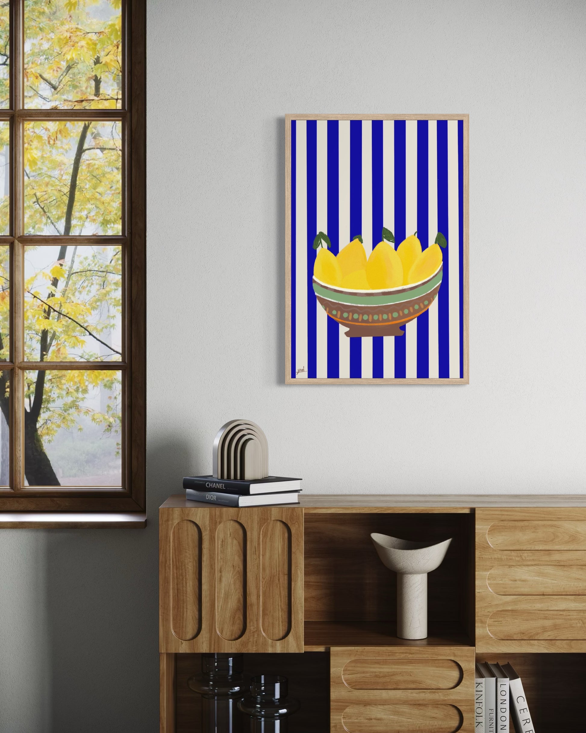 קערה חומה, לימונים צהובים, פסים כחול לבן.