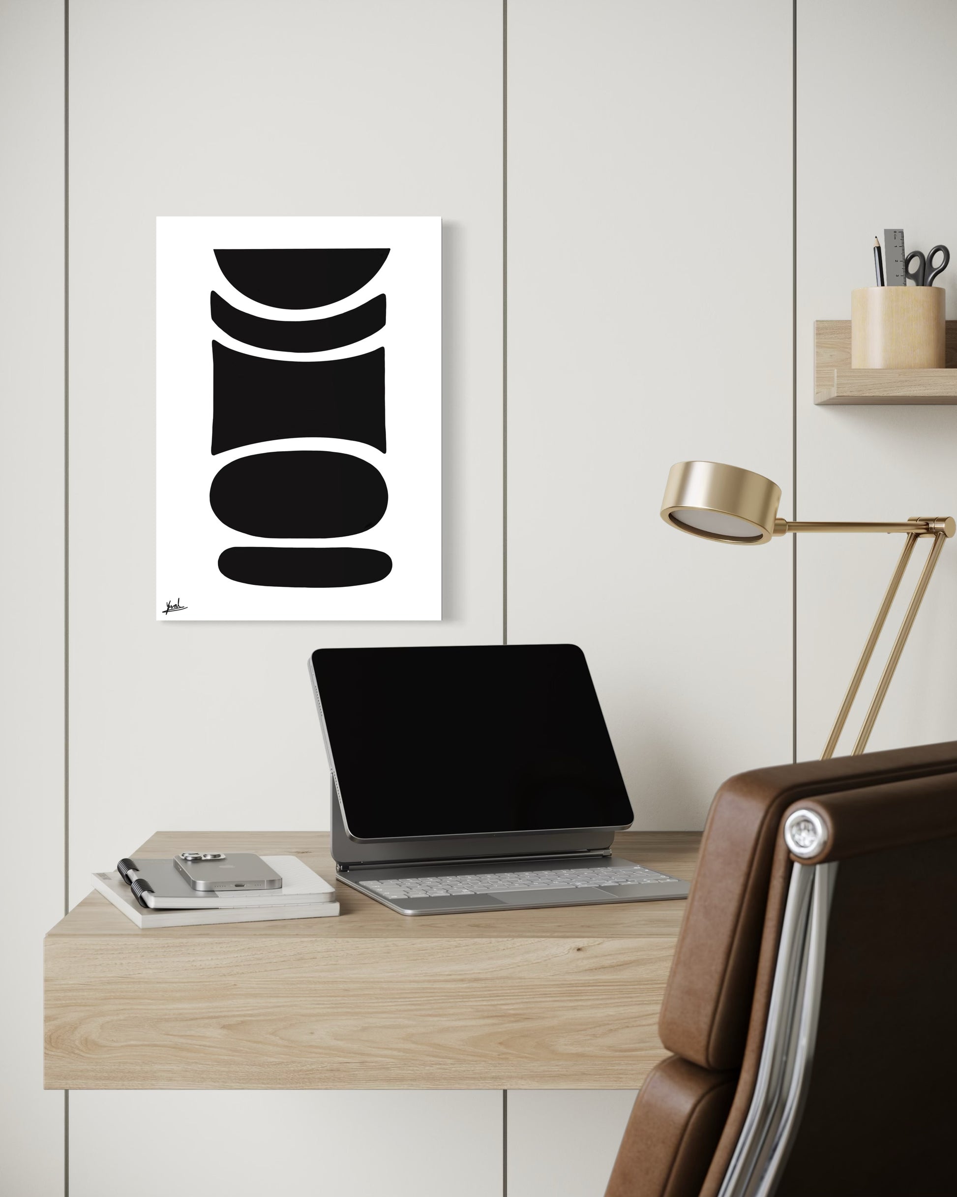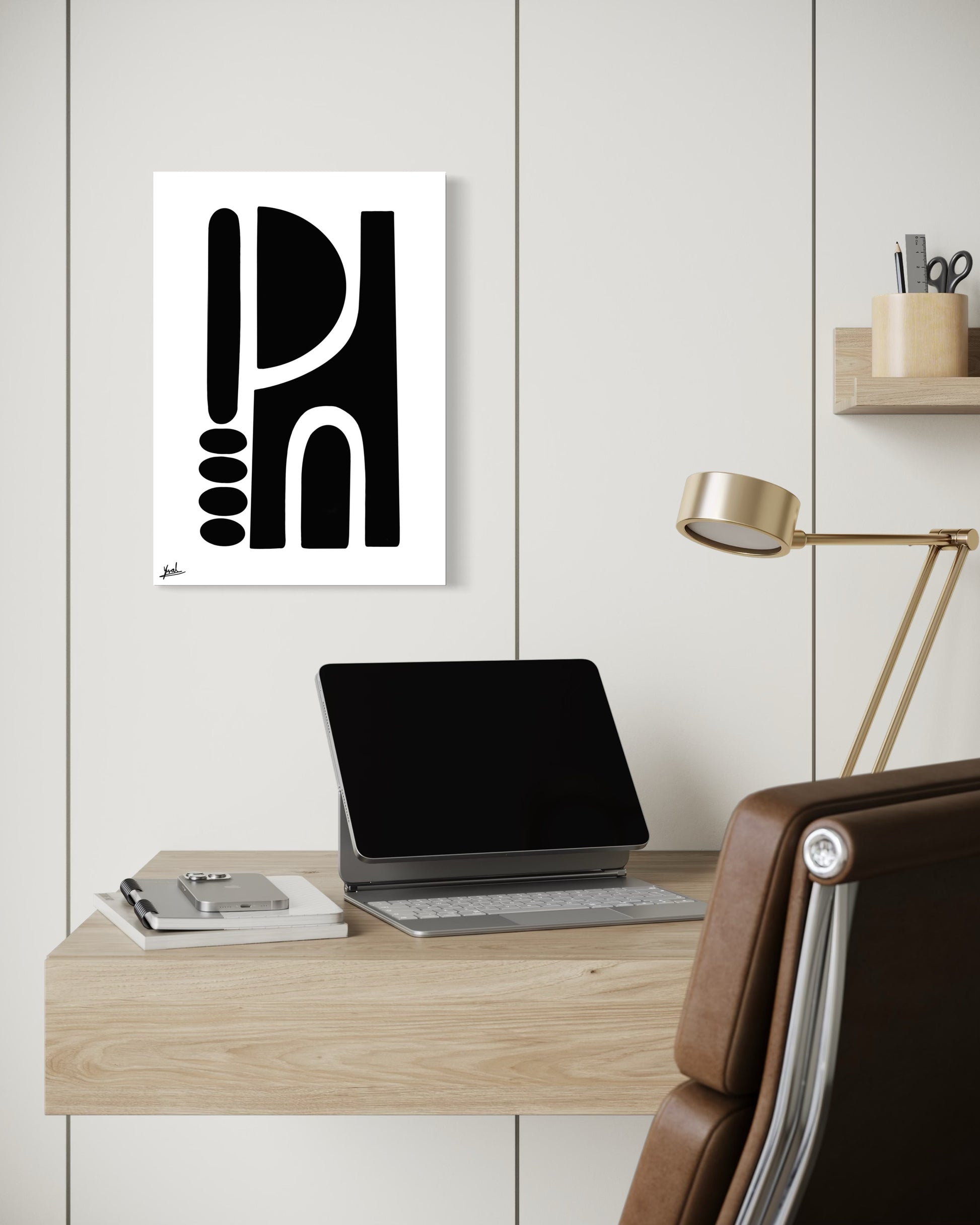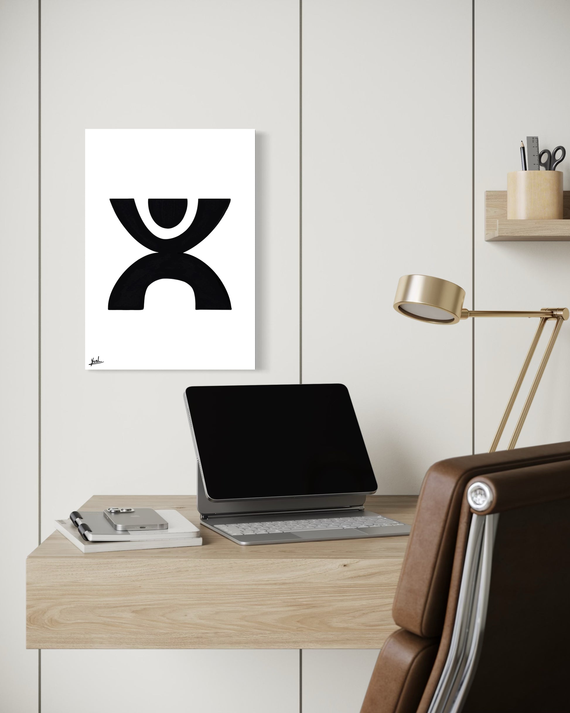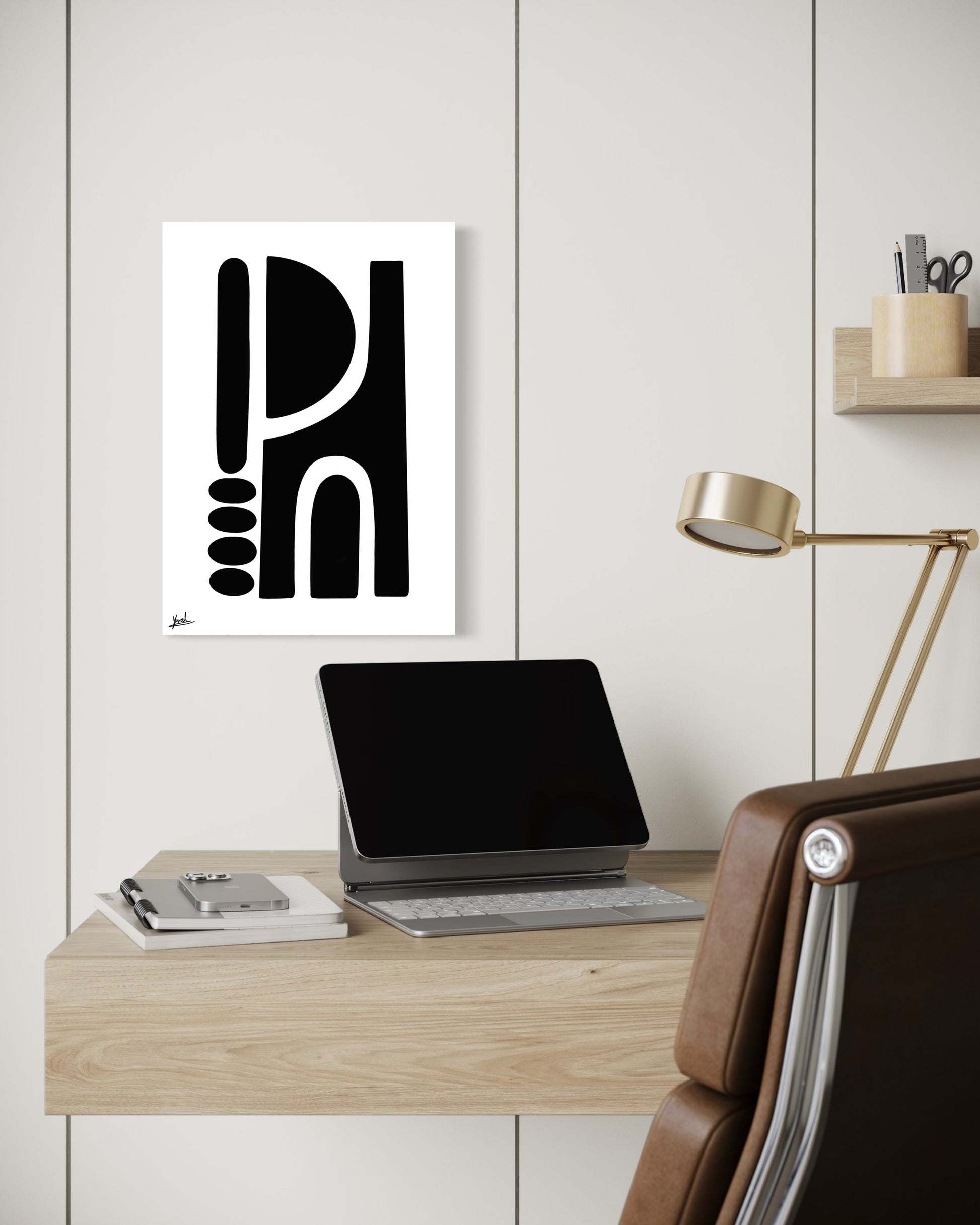 חזקה אך מאופקת, היצירה מוסיפה עומק, קונטרסט וביטחון שקט לחלל.