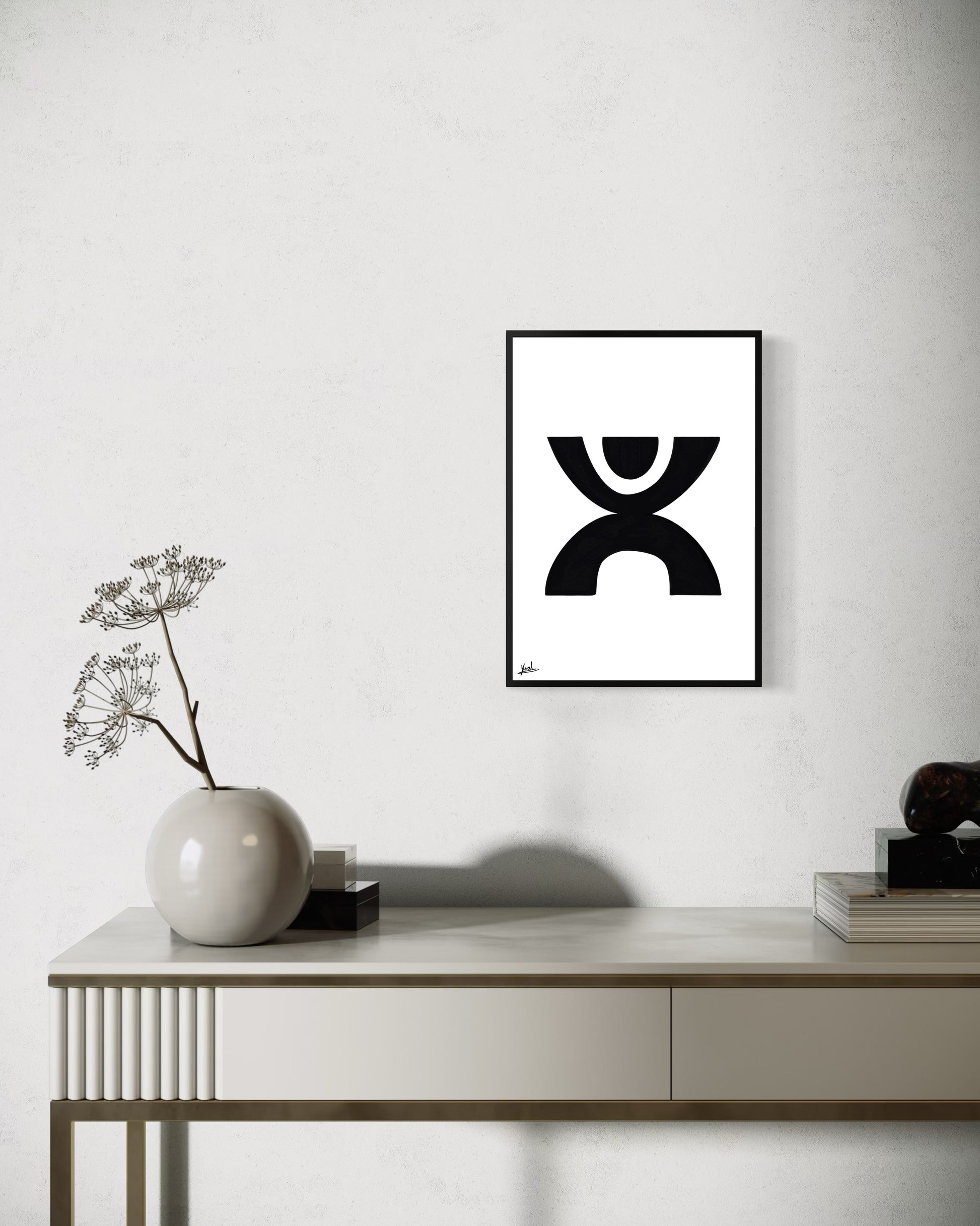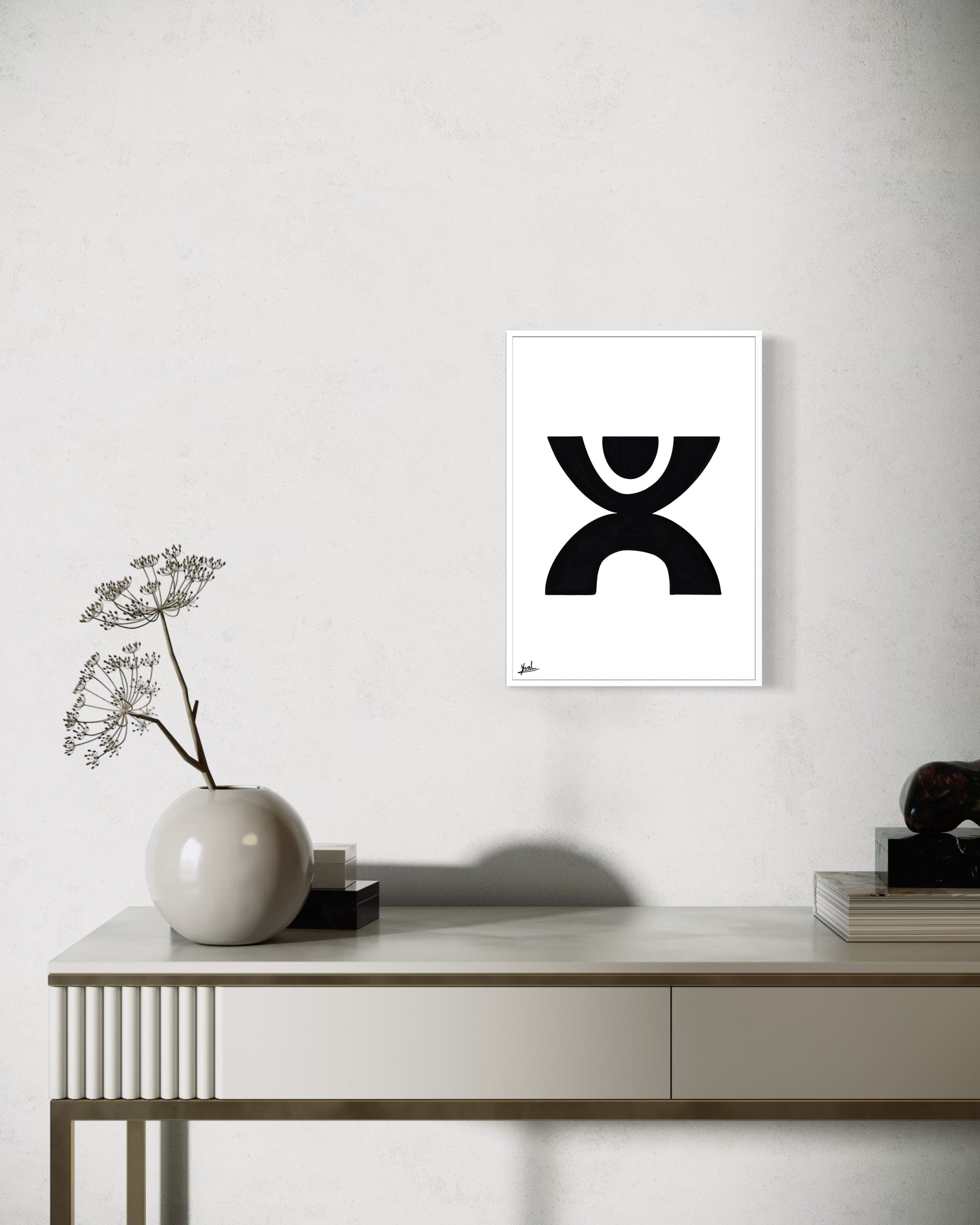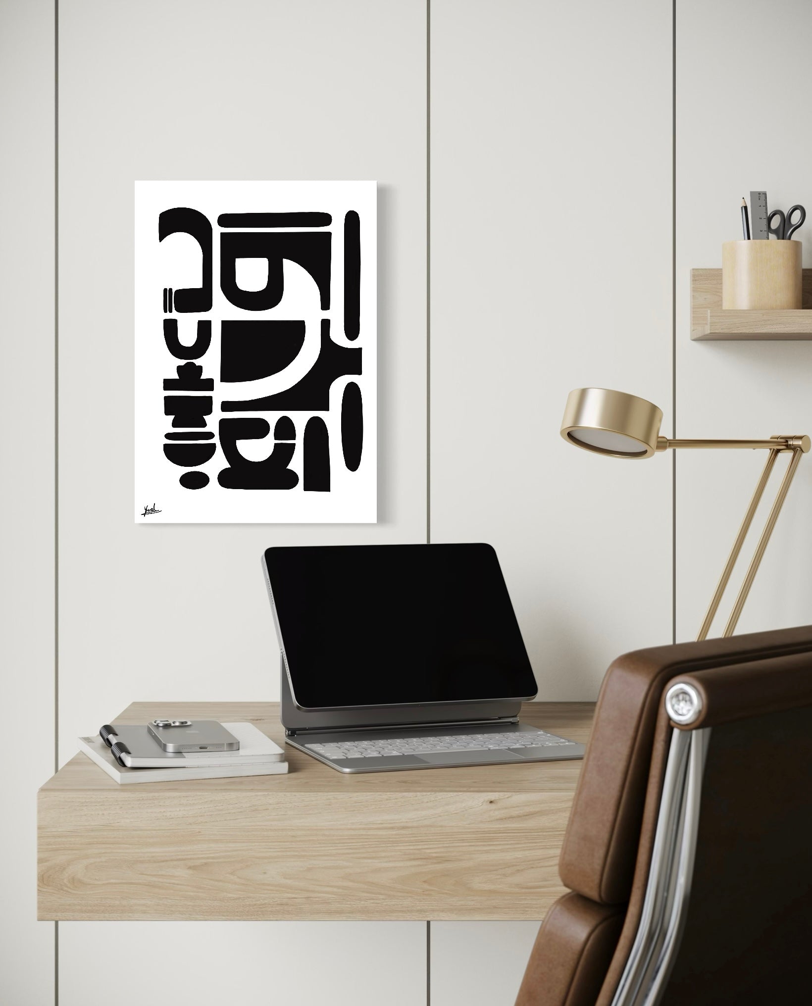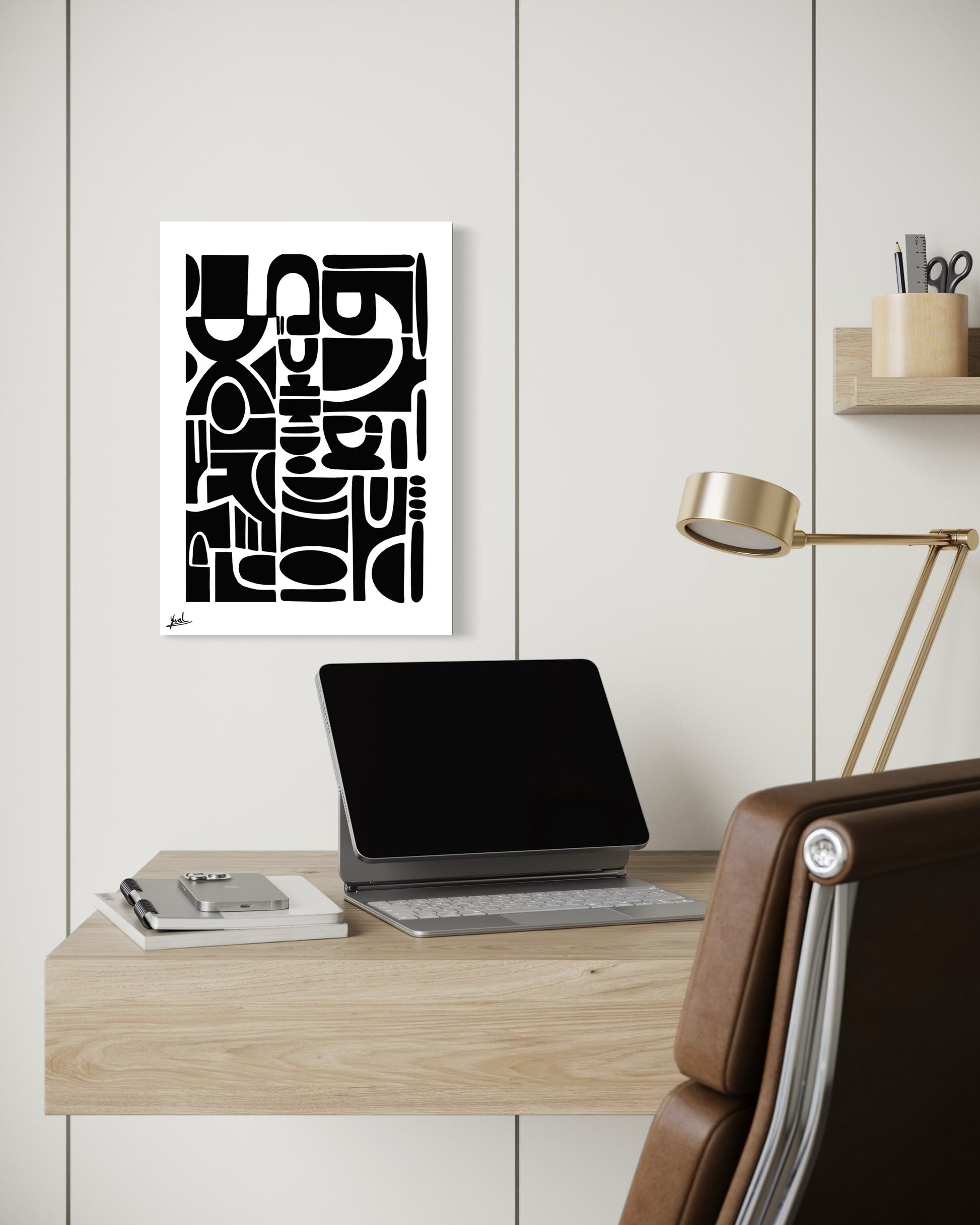 חזקה אך מאופקת, היצירה מוסיפה עומק, קונטרסט וביטחון שקט לחלל.