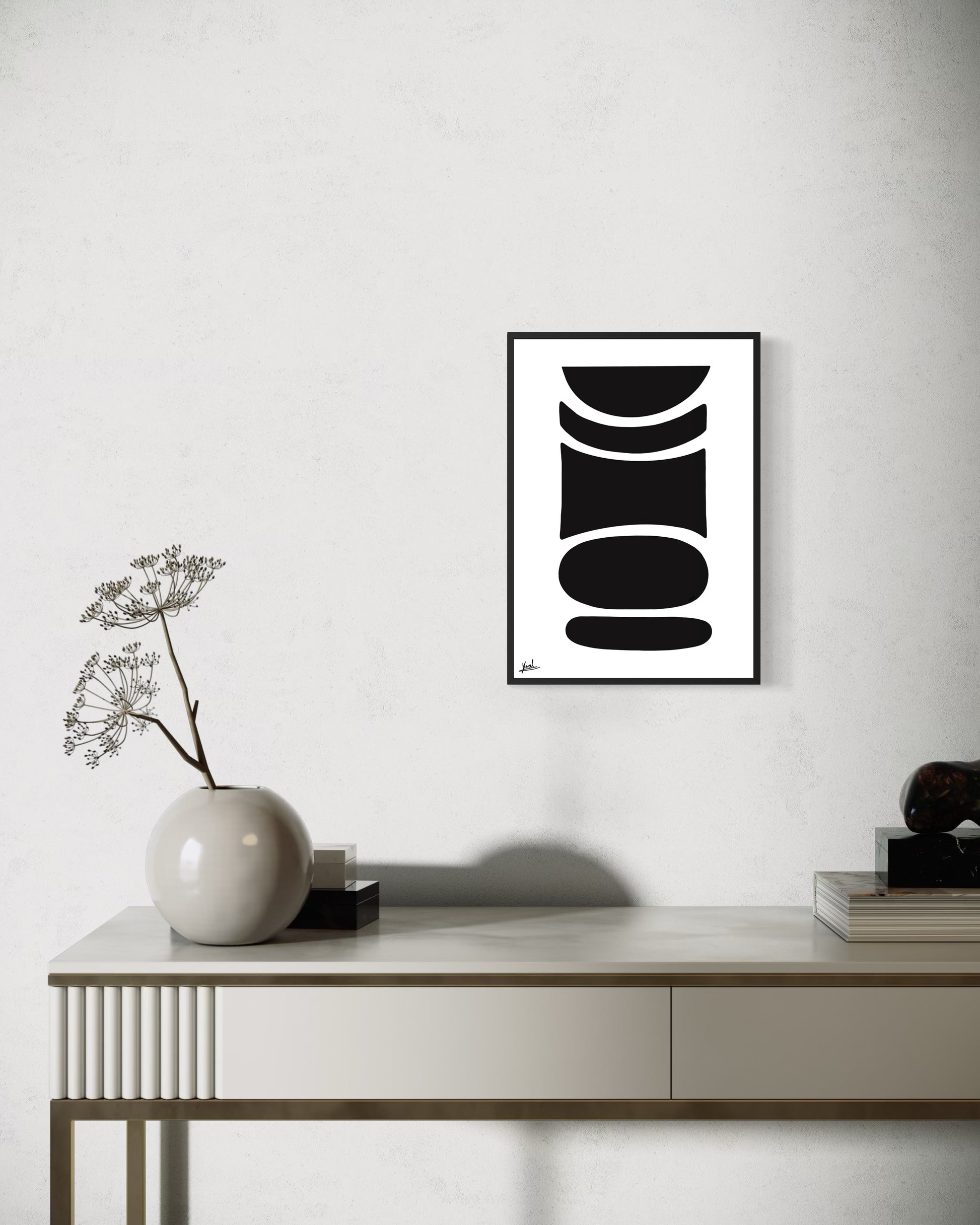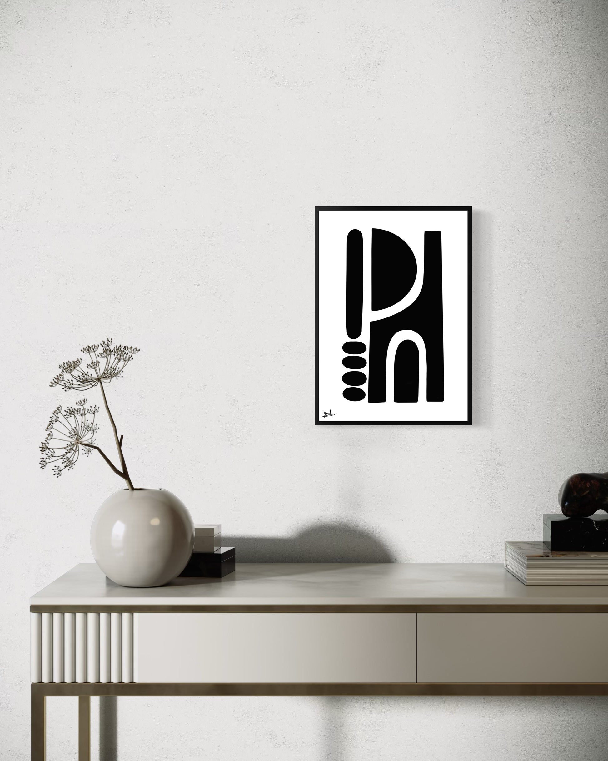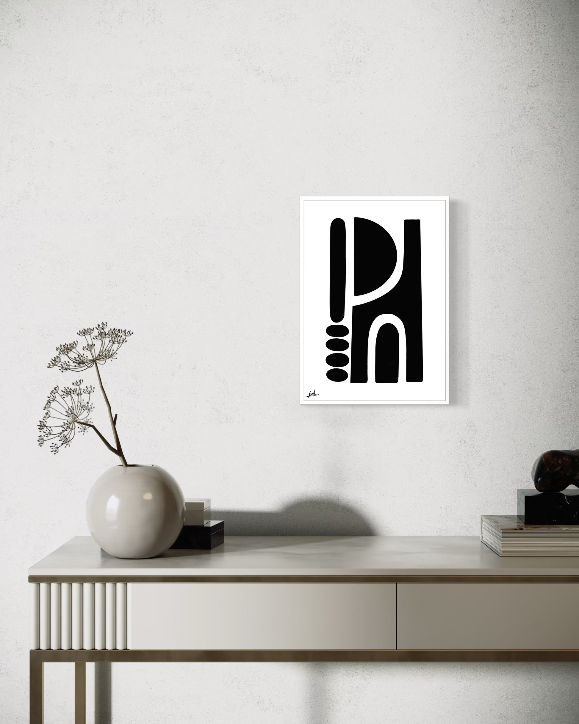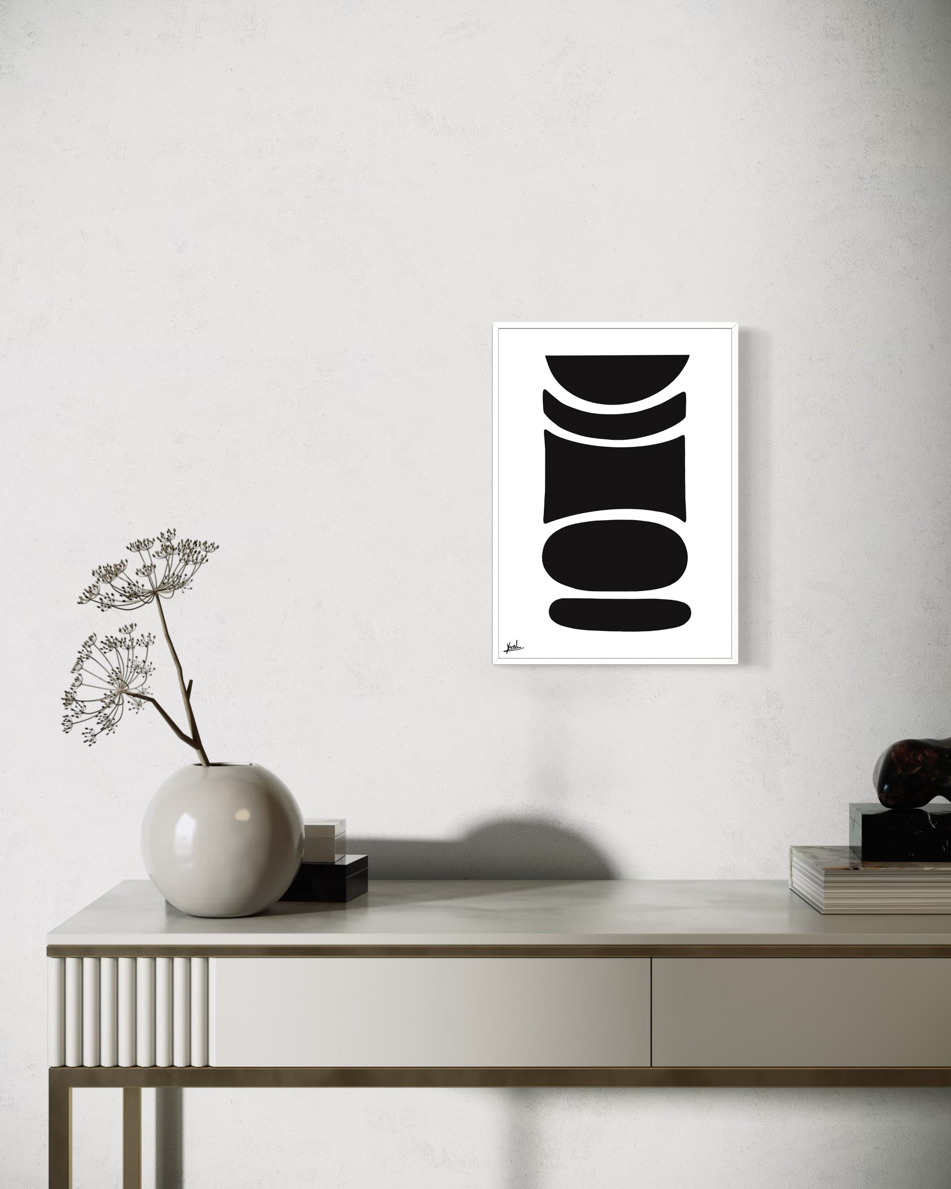 חזקה אך מאופקת, היצירה מוסיפה עומק, קונטרסט וביטחון שקט לחלל.